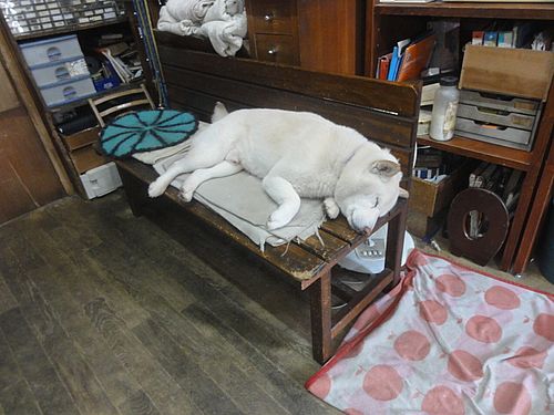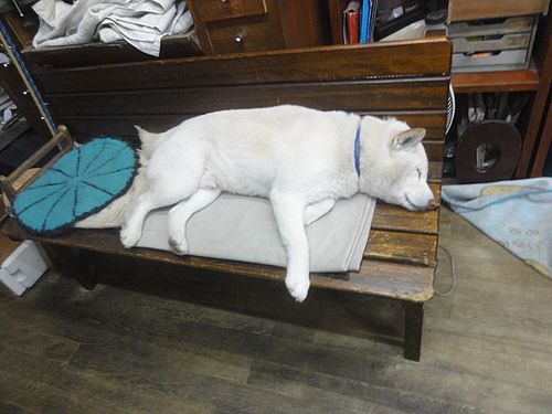 ひもすがら、ベンチで寝ているシロ君です。