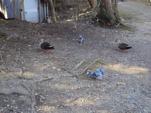 ハトさんとカモさんが仲良く、エサ探しをしています。