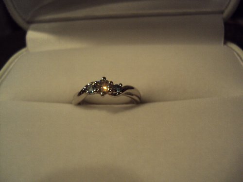 4ミリほどのダイヤの両側には、彼女の誕生石、ブルートパーズが入ってます。