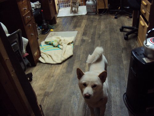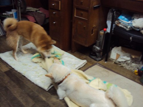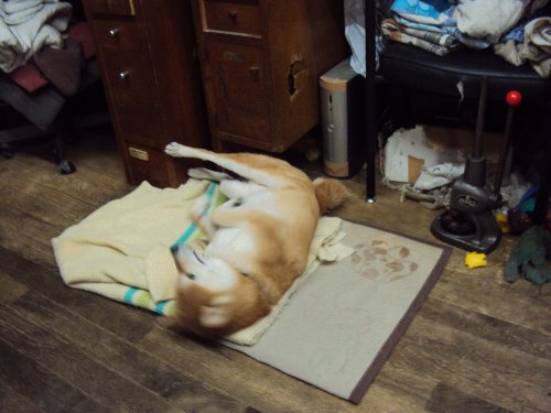 夕ご飯前、退屈になったと見えて、やっと寝たシロ君の布団を