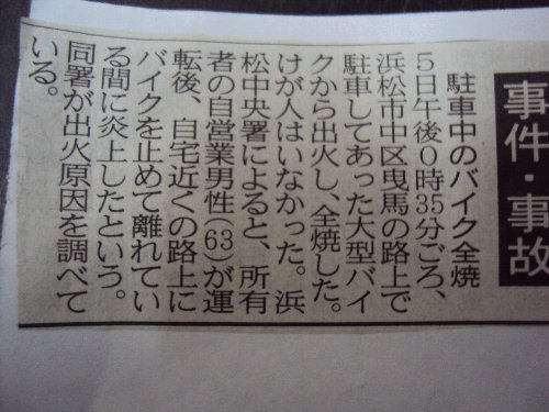 2日ほど前に、例のハーレーが燃えた新聞記事をもらいました。