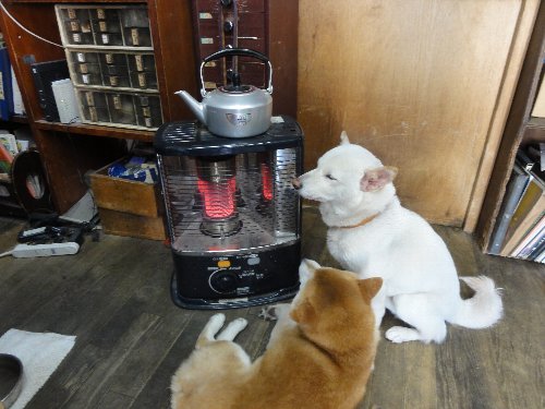 ワンコたちは、相変わらず、ストーブの前でまったりです。