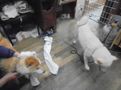 お店に戻って、ワンコたちを拭いてあげて、ご飯をあげて、