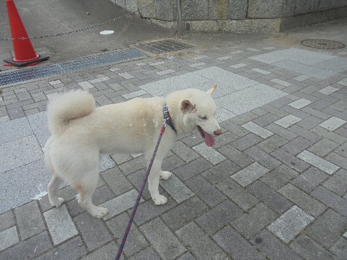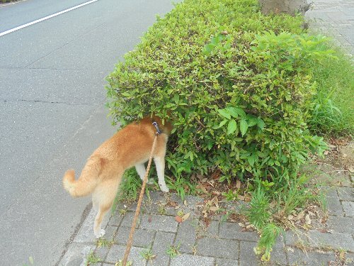 朝の散歩途中、チャロ君が、植え込みに頭つっ込んで