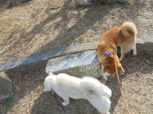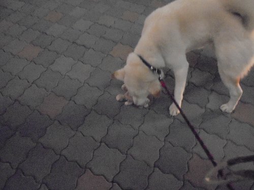 夕方のお散歩の帰り、シロ君、植え込みの所で、何か見つけました。