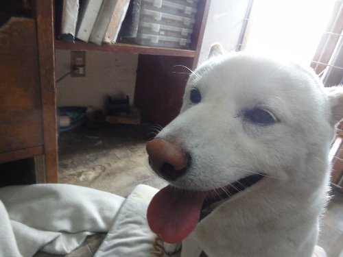 シロ君、おお喜びで、膝の上に乗ってきました。