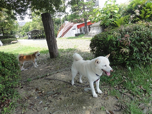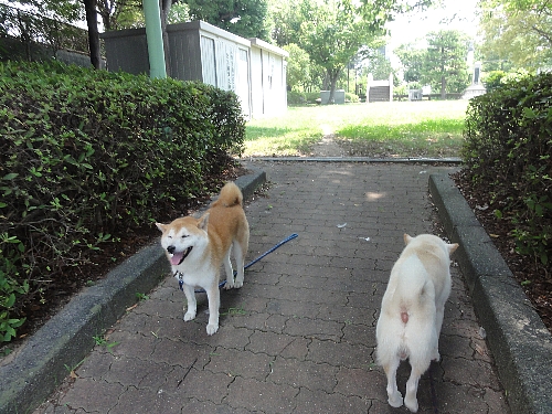 朝のお散歩は、木陰で自然のクーラーを