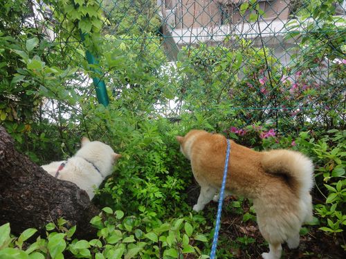 ワンコ達、雨にもめげず、無心に草食べてます。