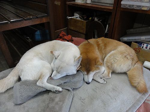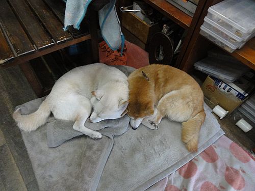ワンコ達、寄り添って寝ていました。