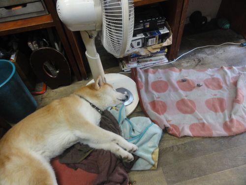 あれ、チャロ君、扇風機のスイッチの所枕にして、寝てるよー。