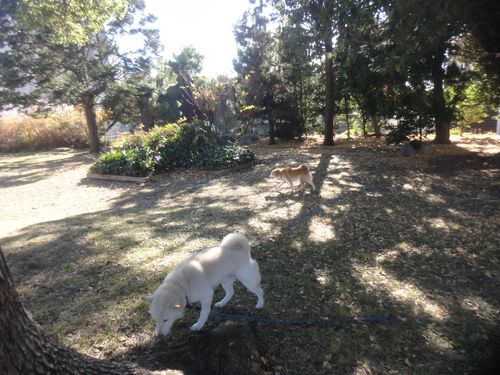 木漏れ日の中、ワンコ達が気ままに遊んでいます。