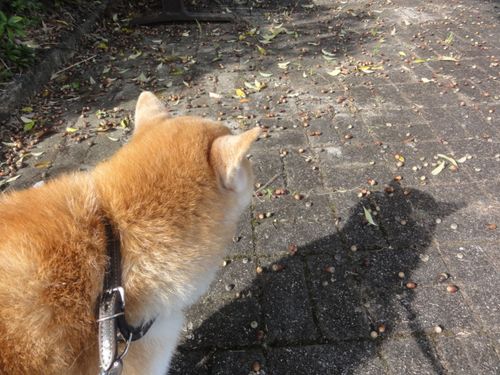 チャロくん、丸いドングリの実いっぱい落ちてるね。
