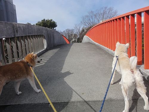 陸橋を渡り始めると、遠くで、さかんにワンコの