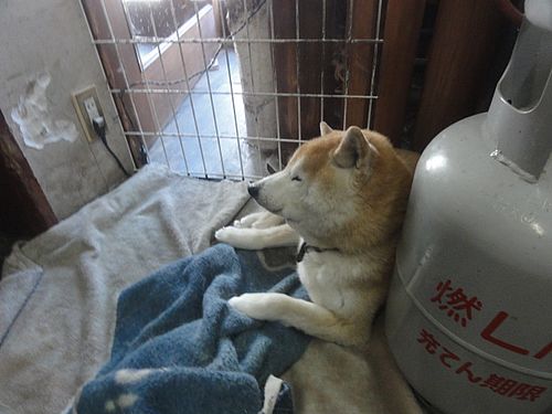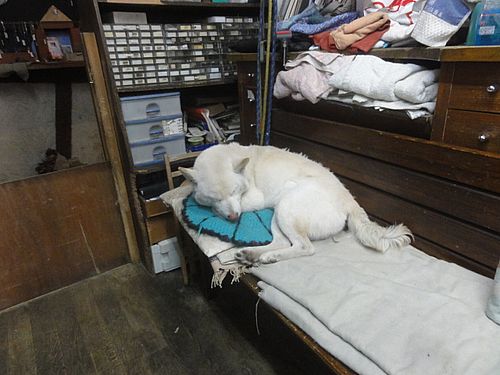 シロ君は、最近お気に入りの、工房入り口のベンチの上で、、、