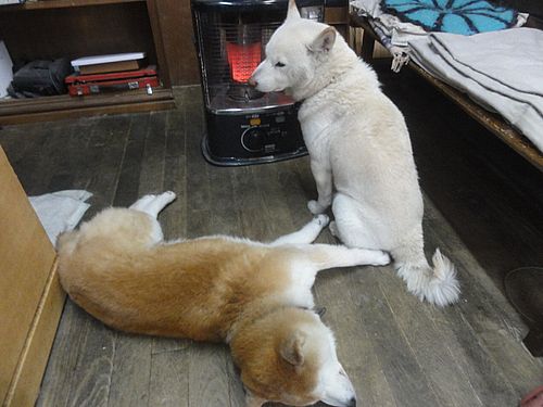 ストーブの前に集合、、、