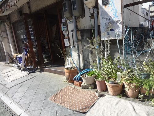 飛ばされないように、お店の前に干しました。